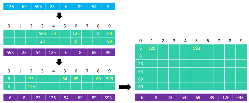 开辟十个数组并编号为0~9,如下图竖着放的十个数组。