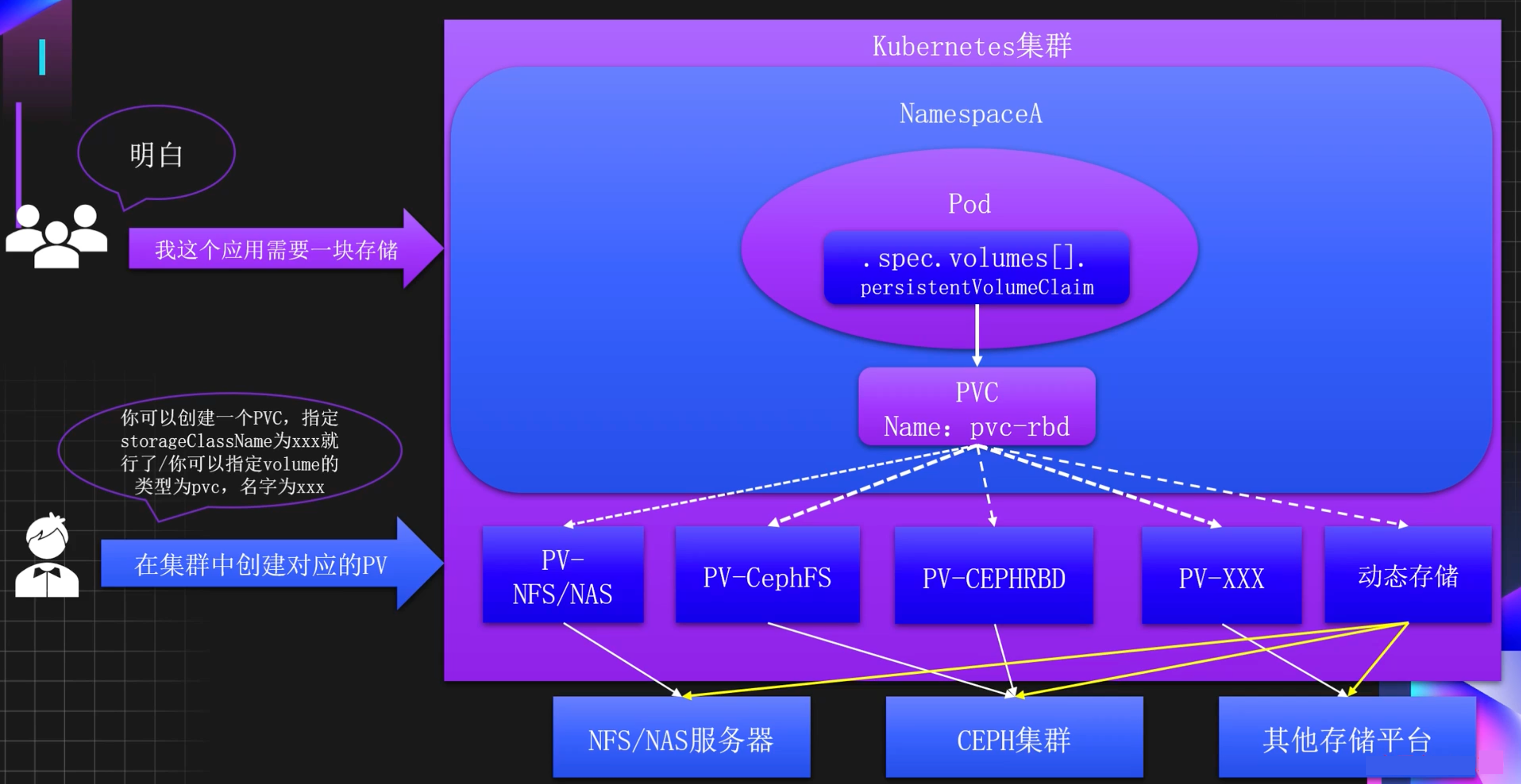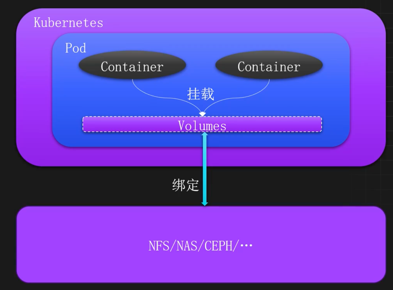 Volumes在Pod中绑定多个、多种的数据类型,比如NFS、NAS、CEPH等,这些绑定的数据可以挂载到Pod中的一个或多个容器中,从而实现容器的数据持久化和数据共享。