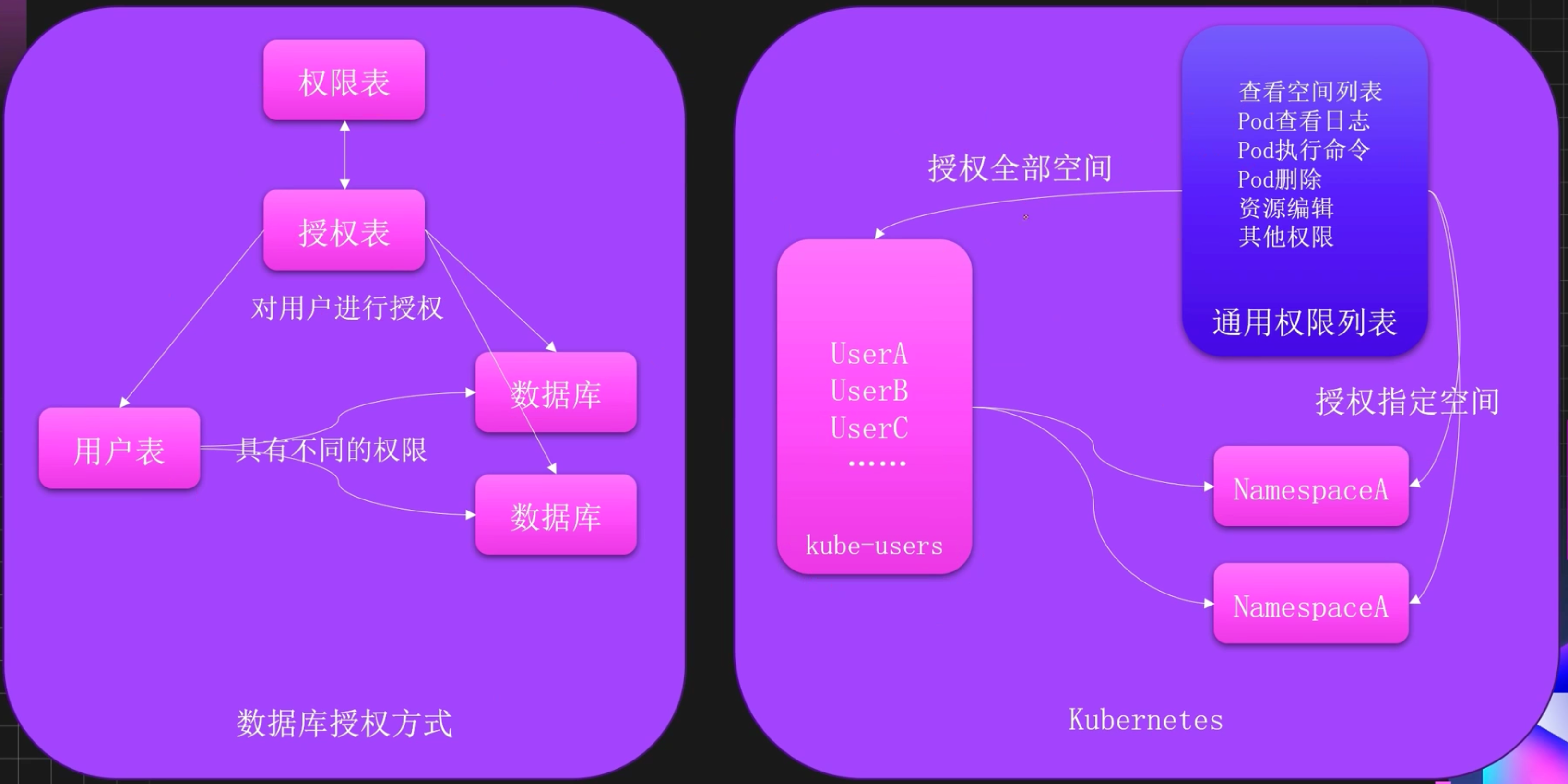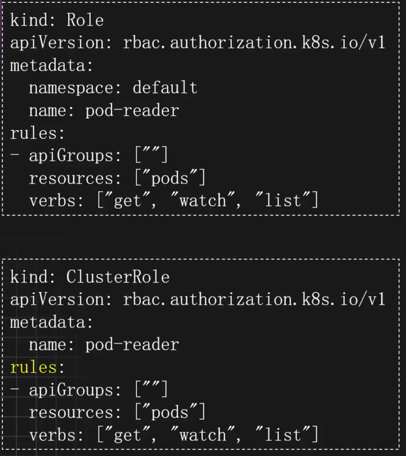 Role:命名空间级别的权限,权限规则仅限于命名空间内ClusterRole:集群级别的权限,权限规则覆盖整个集群,同时可以绑定到某个空间内