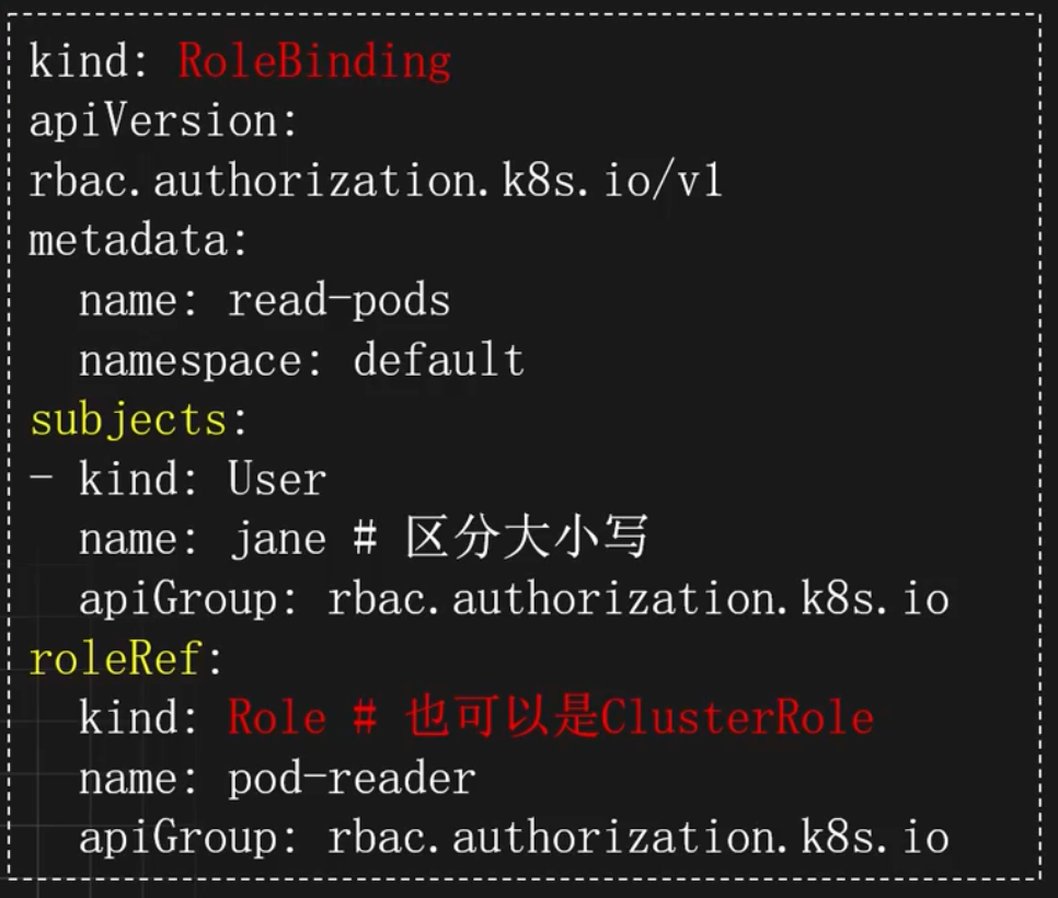 kind:定义资源类型为Role或ClusterRolerules:定义具体的权限规则,切片类型,可以配置多个API Groups:包含该资源的组名称名称,比如apps,为空则为核心组resources:定义对哪些资源进行授权,切片类型,可以定义多个,比如pods、service、"*"等verbs:定义可以执行的操作,切片类型,可以定义多个,比如create、delete、list、get、watch、update、pods/log(子资源)resourceNames:指定授权具体的对象,切片类型,可以定义多个,比如my-deployment